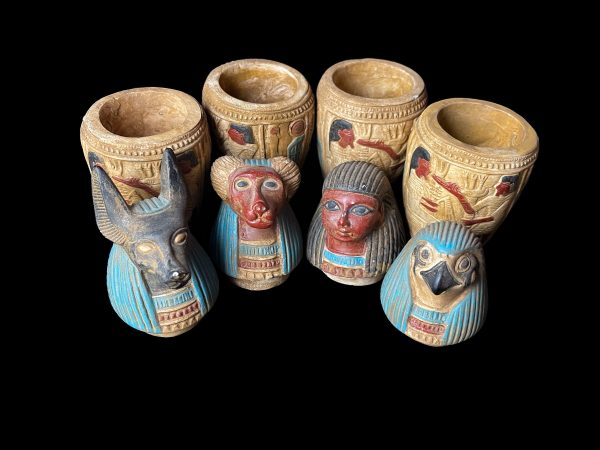 Introducing our exquisite Canopic Jars figures, featuring the iconic Sons of Horus figures. These handcrafted treasures are not only a stunning addition to your home décor but also bring with them the rich history and symbolism of ancient Egyptian culture. Each jar showcases one of the four sons of Horus, representing the guardians of the organs of the deceased. Imsety, Hapi, Duamutef, and Qebehsenuef come to life in these unique and intricately designed Canopic jars, making them a must-have for collectors and history enthusiasts alike.
