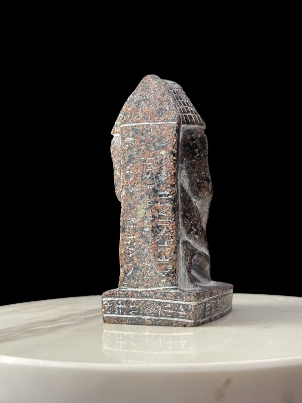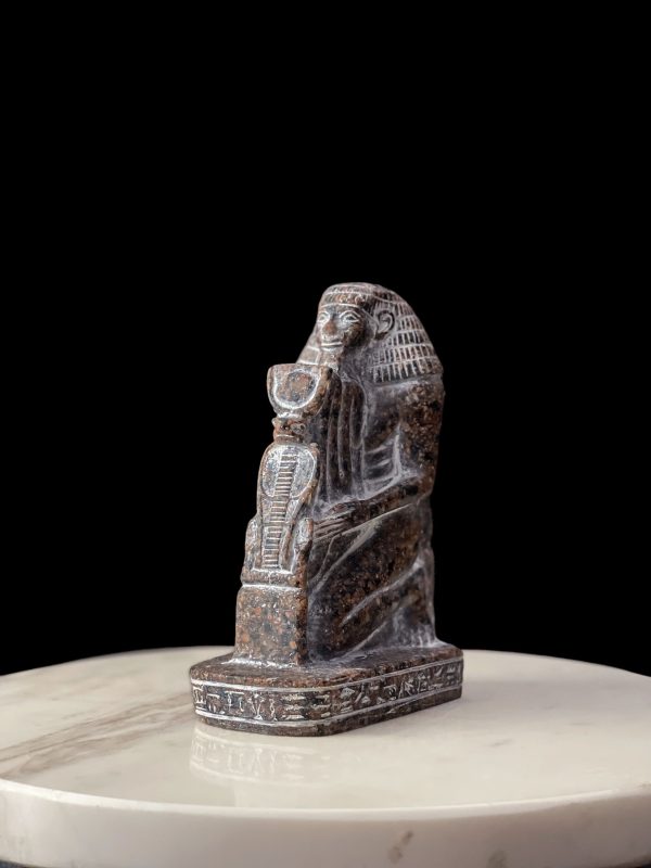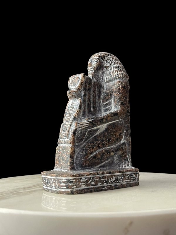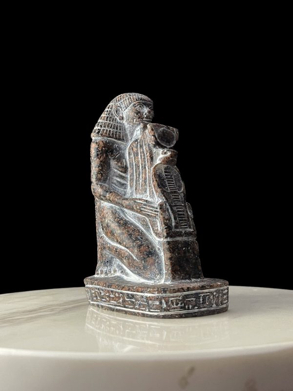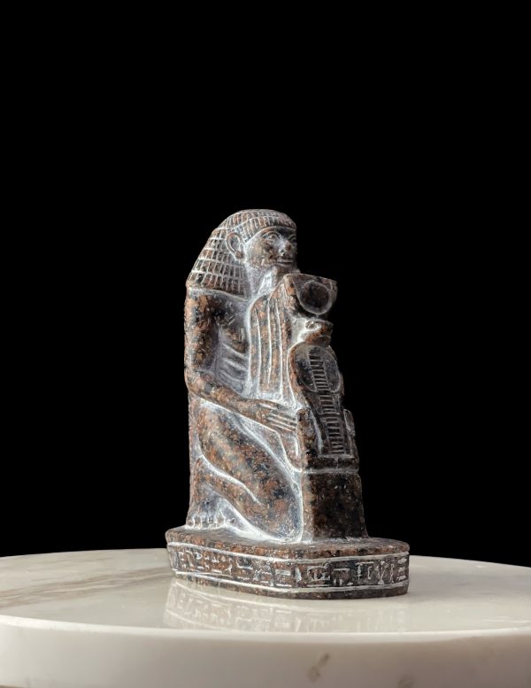 Egyptian High priest statue protecting Wadjet Cobra with the Sun disk of Goddess Hathor
