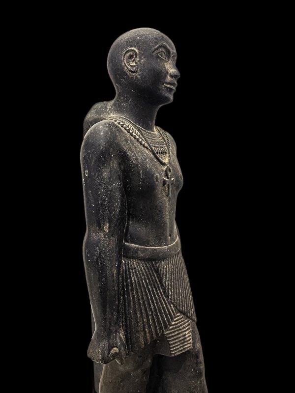 The statue features Horemakhet, portrayed as a falcon-headed figure, standing tall and majestic. His falcon head, symbolizing his connection to the sky and the sun, is intricately carved with remarkable attention to detail. He is depicted wearing the traditional royal headdress, the Double Crown of Upper and Lower Egypt, signifying his authority and power.