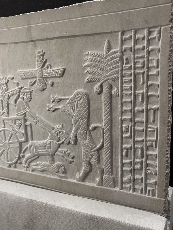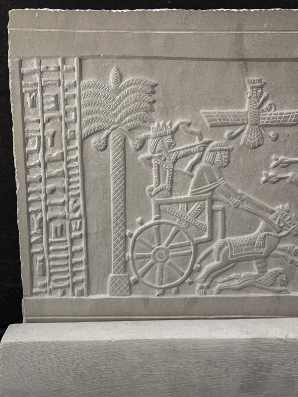 The artwork in question is a captivating piece that combines elements of ancient Persian and ancien Assyrian made by egyptian hands , featuring intricate carvings of the Darius seal, the great Persian king, a royal chariot, and the divine figure of Ahura Mazda.