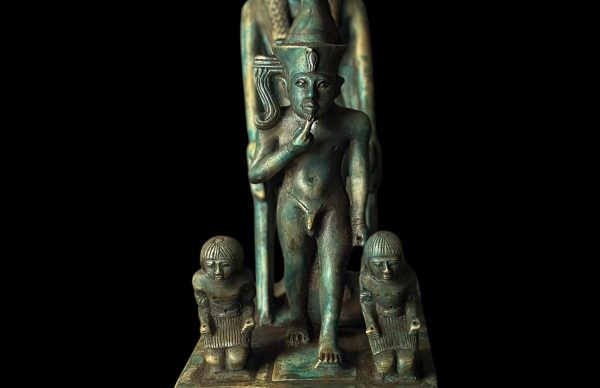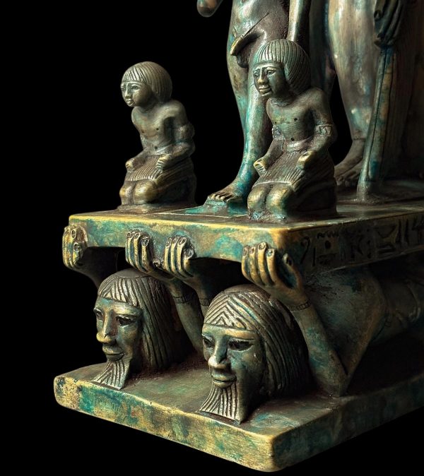 Vintage Goddess Isis is protecting God Horus with a high priest. Egyptian copy Museum statue